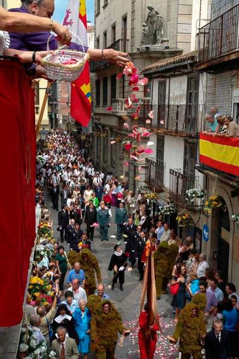 Entre lluvias de pétalos y tomillo, la comitiva integrada por autoridades, cofrades, niños de primera comunión y hombres de musgo recorre las calles. Finaliza el desfile en la Plaza Mayor, ante la iglesia de El Salvador, con las banderas rindiendo homenaje al Santísimo Sacramento.